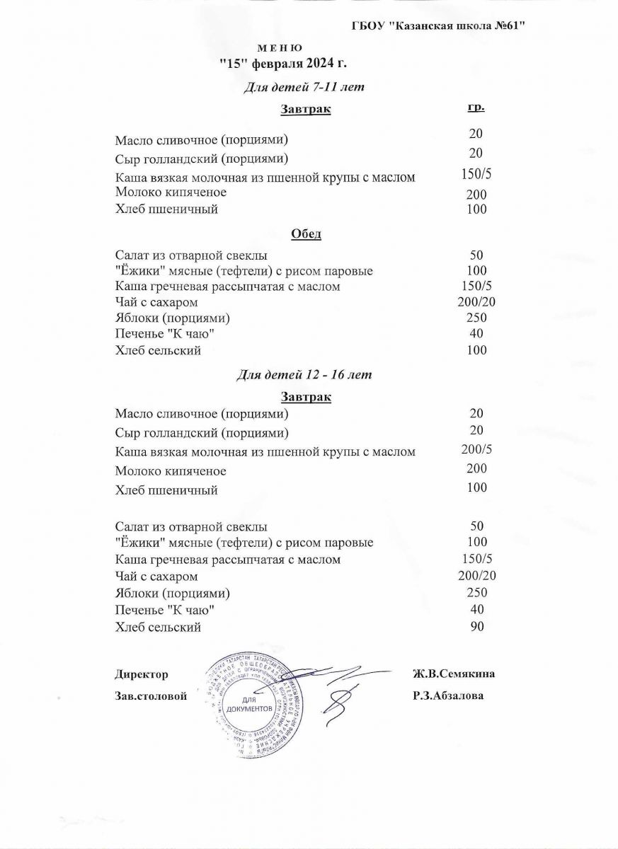 Меню на период с 15 по 20 февраля 2021 г.