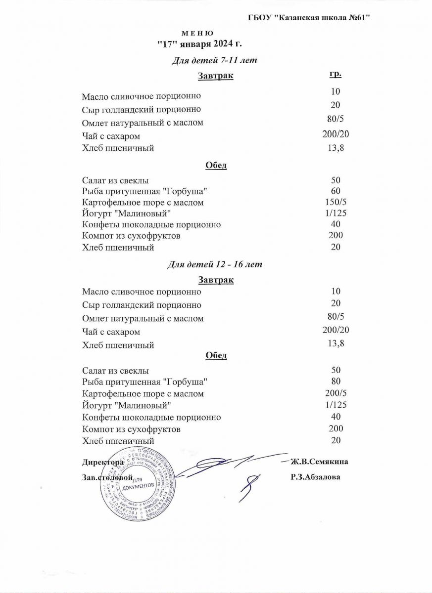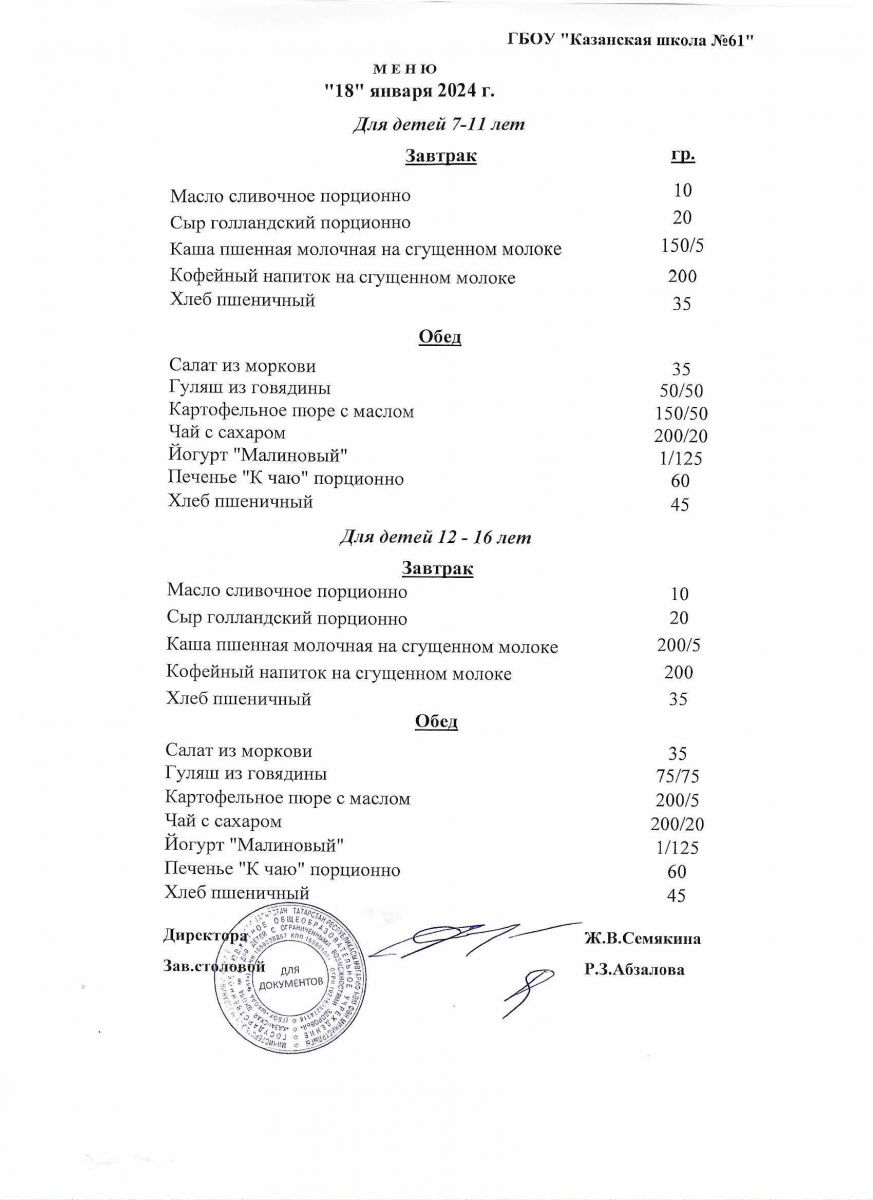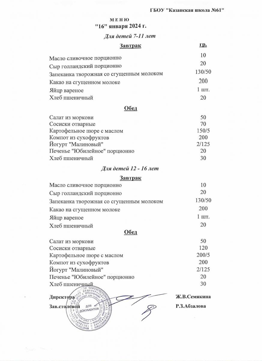 Меню на период с 16 по 20 января 2023 г.