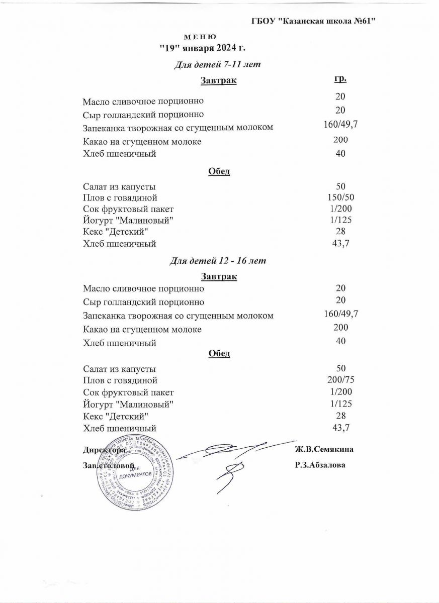 Меню на период с 12 по 19 января 2022 г.
