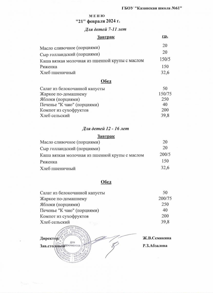 Меню на период с 1 по 21 февраля 2022 г.