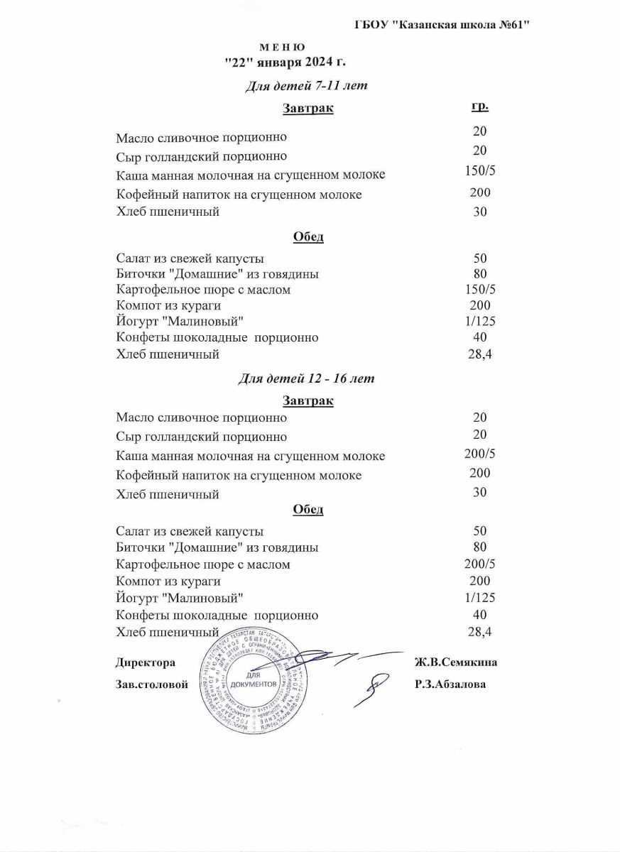Меню на период с 20 по 31 января 2022 г.