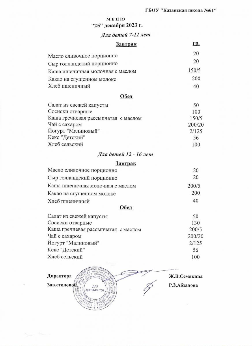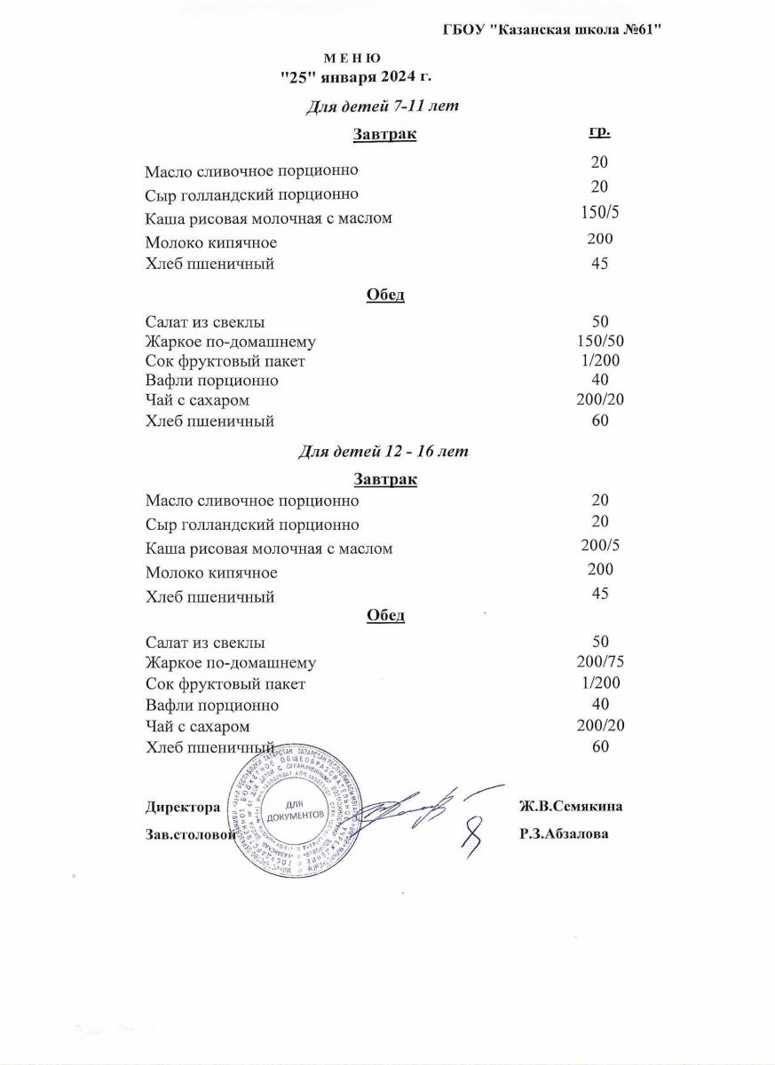 Меню на период с 23 по 25 января 2023 г.