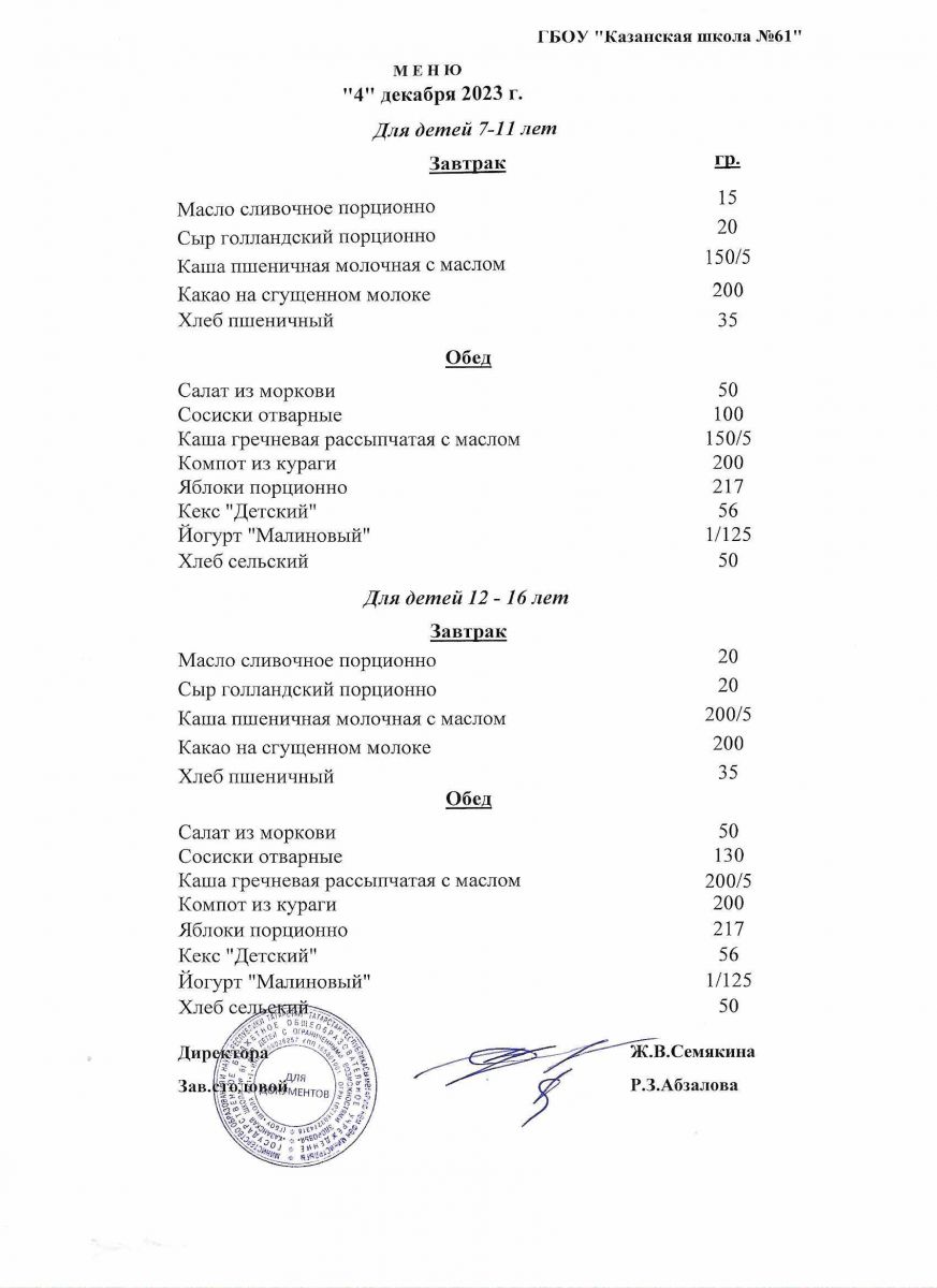 Меню на период с 1 по 10 декабря 2021 г.