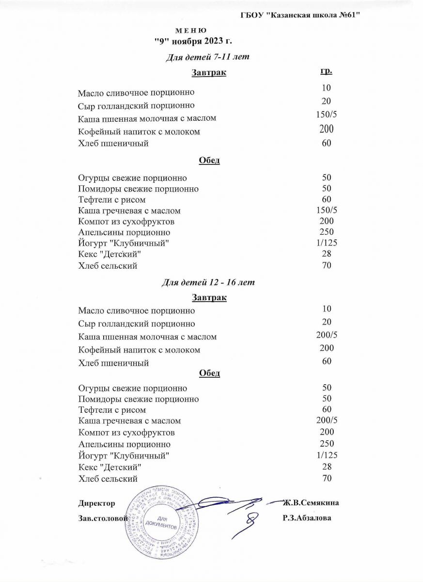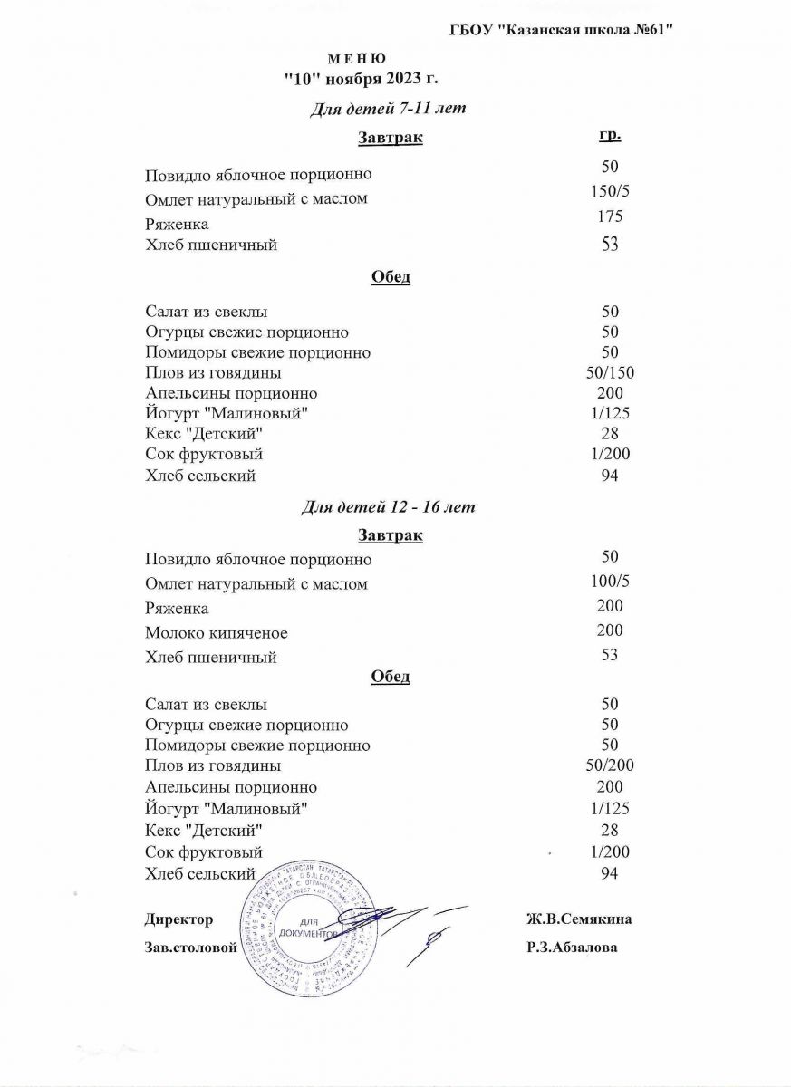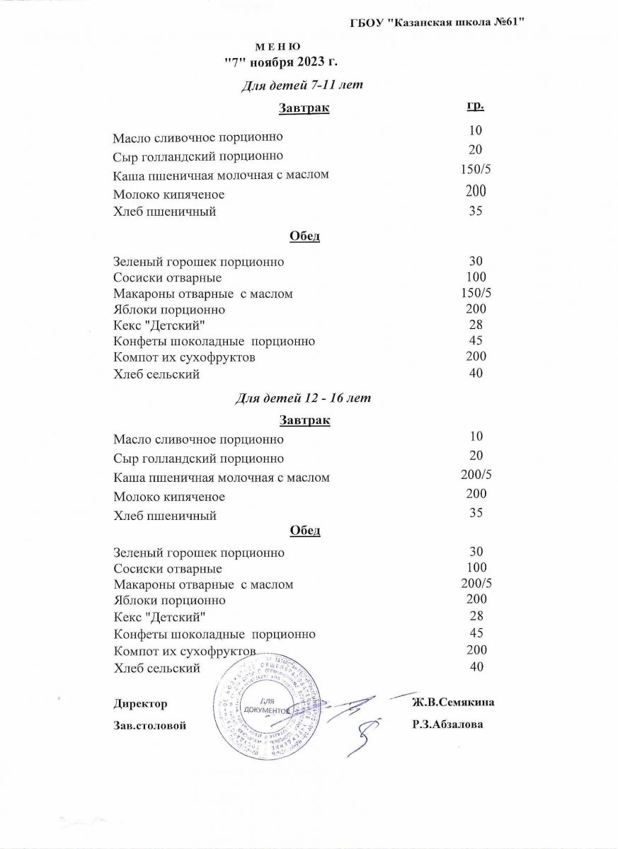 Меню на период с 7 по 10 ноября 2022 г.