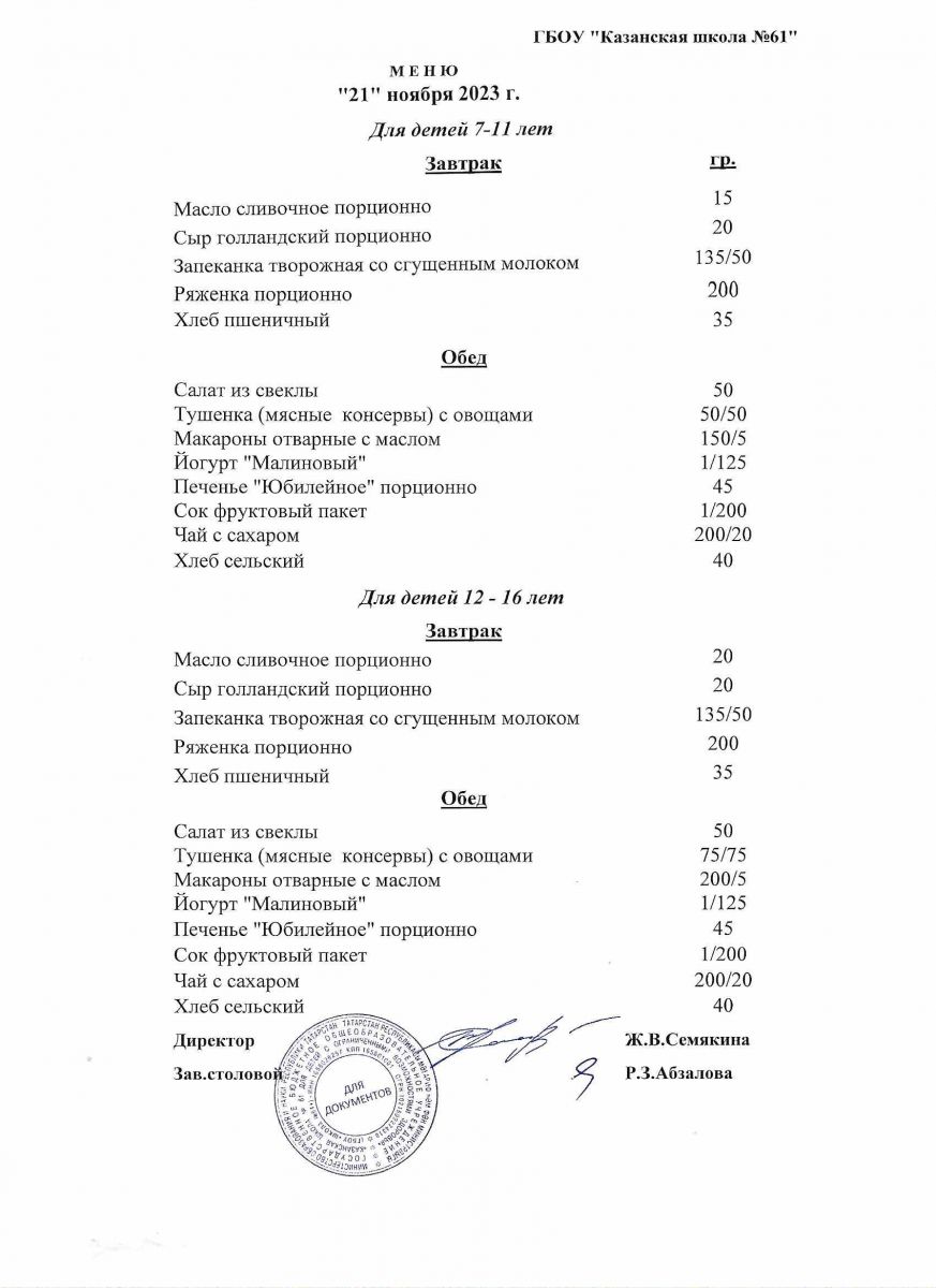 Меню на период с 11 по 30 ноября 2021 г.