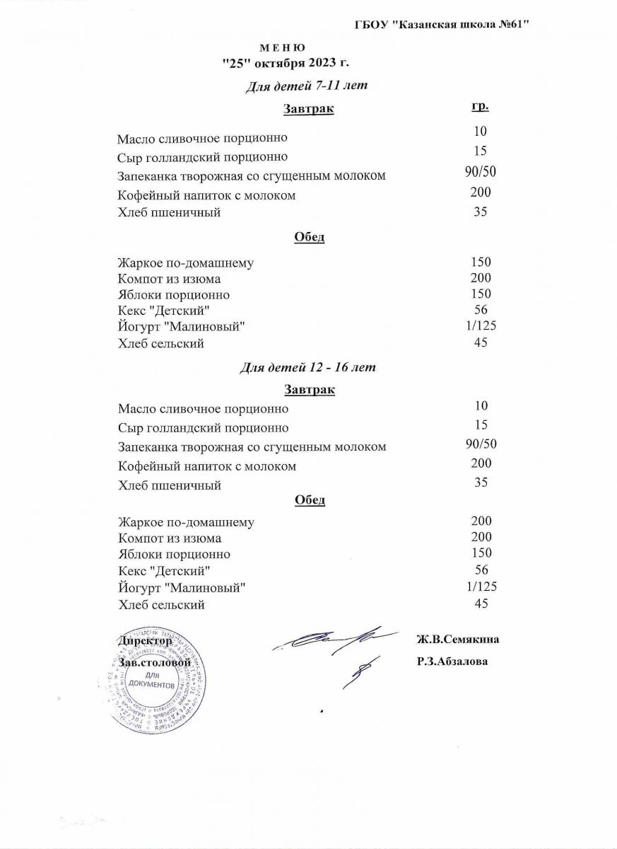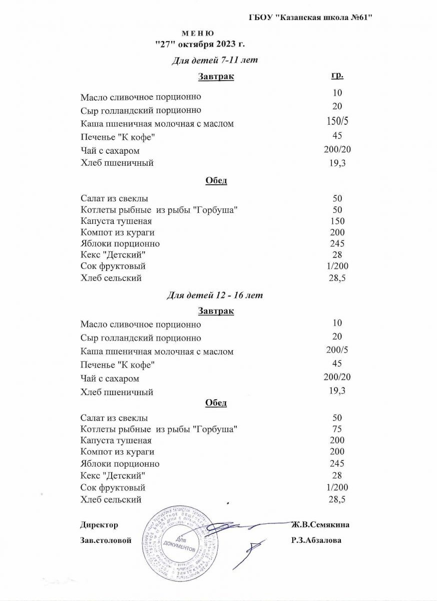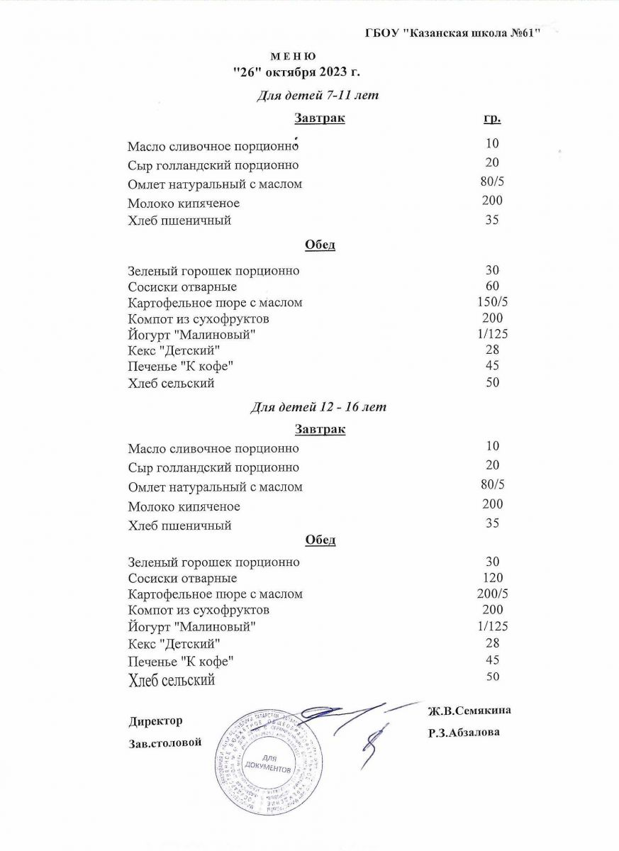 Меню на период с 26 по 28 октября 2022 г.
