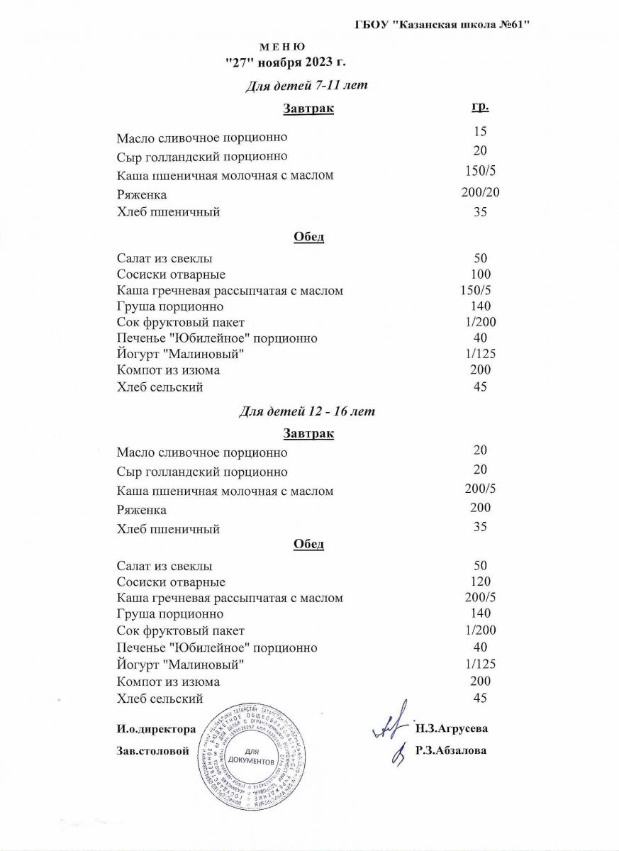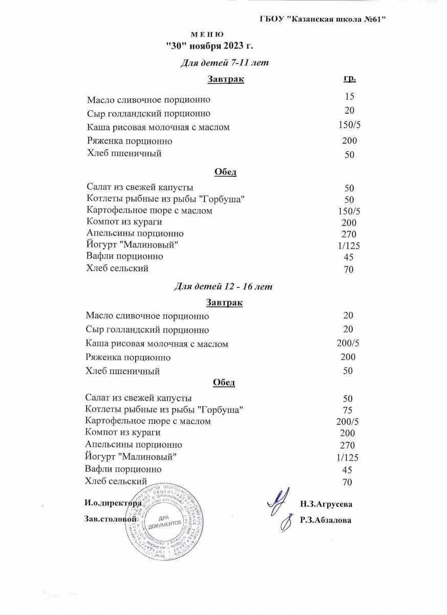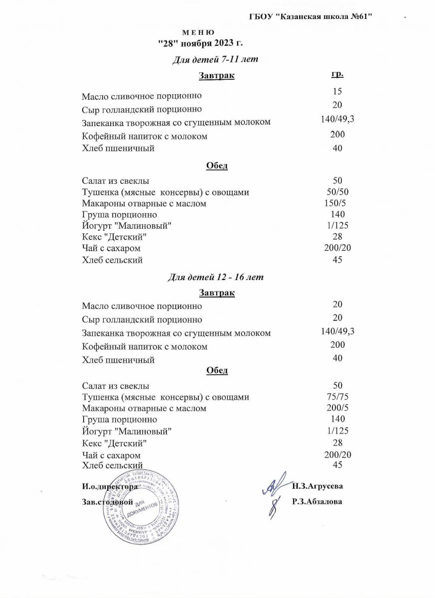 Меню на период с 28 по 30 ноября 2022 г.
