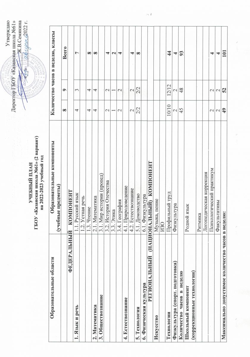 Учебный план на 2022-2023 учебный год (8,9 классы, 2 вариант)