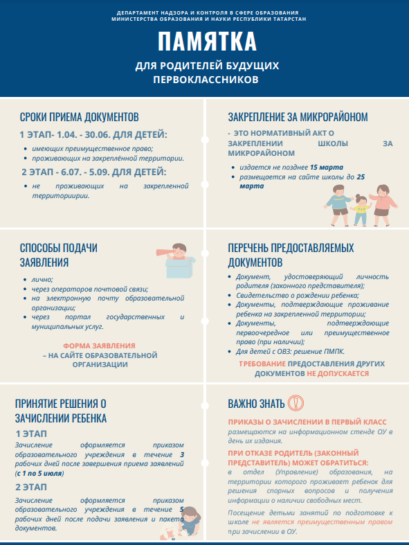Приёмная кампания по зачислению в 1 класс стартует 1 апреля 2024 года Уважаемые родители и законные представители будущих первоклассников! В 2024 году кампания по приёму в первые классы муниципальных школ Казани начнётся 1 апреля 2024 года. Заявления принимаются в следующие сроки: Способы подачи заявления |