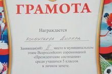 Ученица 5 класса Холбутаева Д. учавствовала и заняла 2 место в муниципальном этапе Всероссийских соревнований "Президентские состязания" среди учащихся 5 классов в личном зачете. Поздравляем!