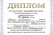 Актанышта үткән «Туган телем – шагыйрьләр теле» гомуми урта белем бирү йортлары укучыларының 2 нче республика фәнни – эзләнү конференциясендә чыгыш ясаган 7нче класс укучысы Хафизов Нәфис Фәнис улы Татарстан Республикасы мәгариф һәм фән министрлыгының 2нче дәрәҗәдәге дипломы белән бүләкләнде...