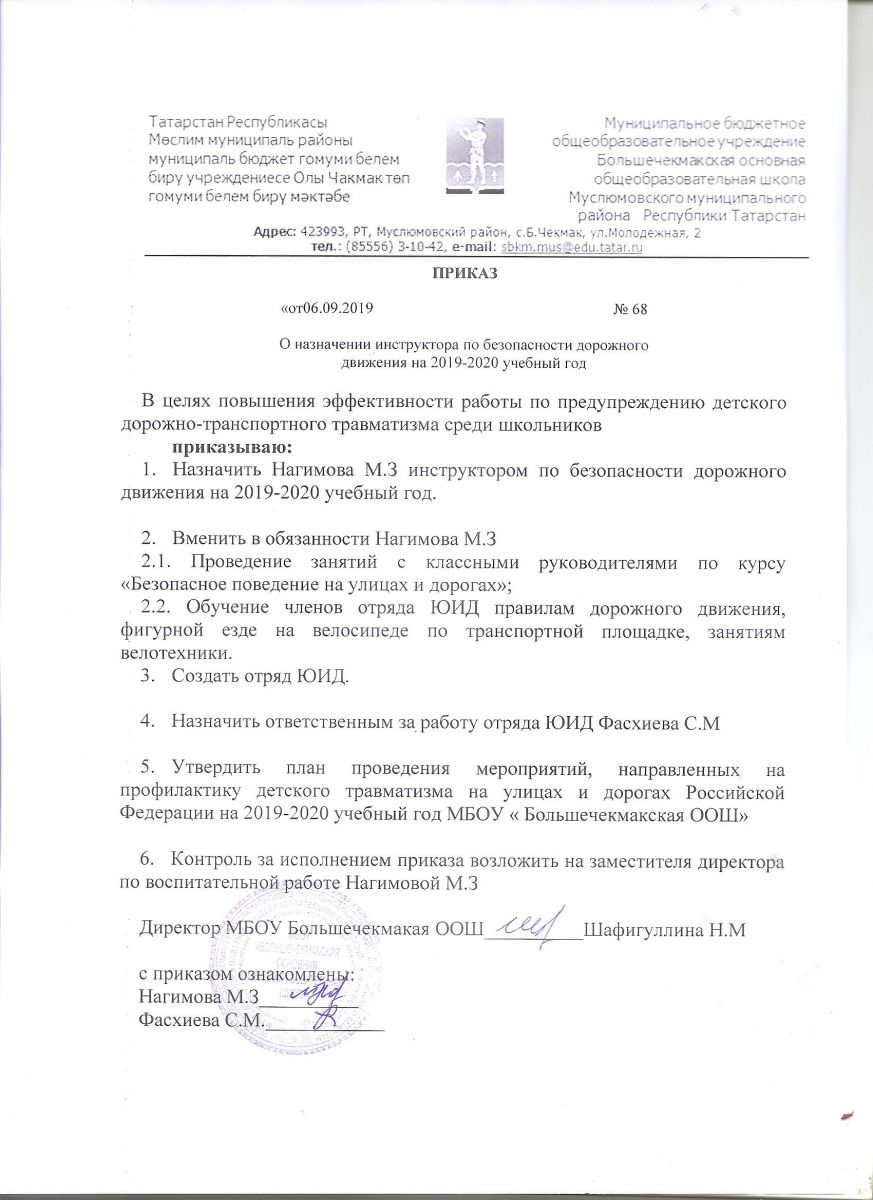 Приказ о назначении инструктора по БДД на 2019-2020 учебный год