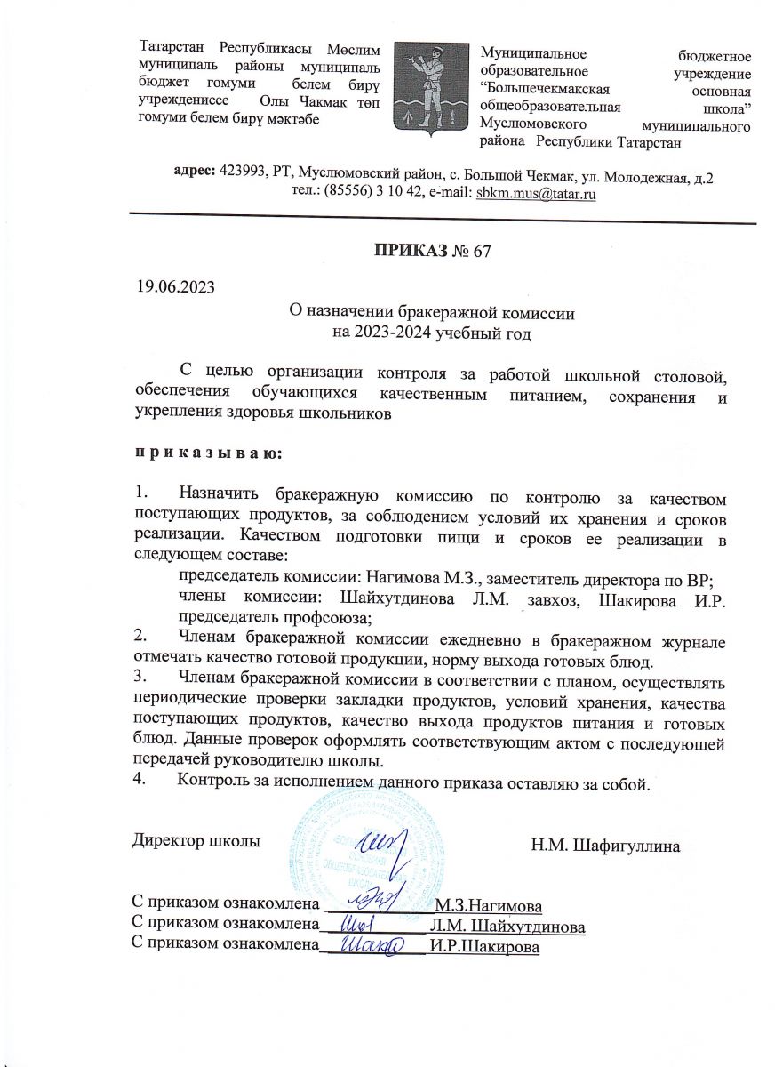 Приказ о назначении бракеражной комиссии на 2023-2024 учебный год