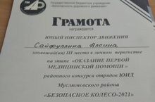 Мәктәпнең ЮИД командасы членнары Мөслимдә үткән ярышта актив катнаштылар .Команда рәхмәт хатына ,ә 3 нче сыйныф укучысы Сәйфуллина Алсинә медицинадан беренче ярдәм күрсәтү буенча 3 урынга лаек булды.Җитәкчеләре Гыйләҗетдинова Р.Ә.\ Юные участники команды ЮИД активно участвовали на конкурсе и был награждены благодарственным письмом.А ученица 3 класса Сайфуллина Алсина заняла 3 место по оказанию первой медицинской помощи.Руководитель команды Гилазетдинова Р.А.