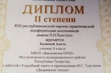 Поздравляем ученицу 8 класса Хазиеву Адилю с победой в республиканской конференции имени Л.Н.Толстого. Руководитель - Ардуганова Г.Х.