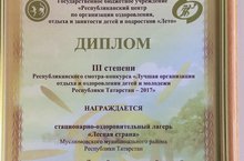 Поздравляем!!! Диплом III степени Республиканского смотра-конкурса "Лучшая организация отдыха и оздоровления детей и молодежи Республики Татарстан-2017" стационарно-оздоровительный лагерь "Лесная страна" Муслюмовского муниципального района РТ в номинации "Лучший муниципальный детский оздоровительный лагерь Республики Татарстан.