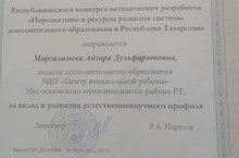 Поздравляем Миргалимову Айзиря Дульфаритовну,педагога дополнительного образования ЦВР Офык, Айзиря Дульфаритовна получила грамоту Республиканского конкурса методических разработок "Переспективы и ресурсы развития системы дополнительного образования в Республике Татарстан" за вклад в развитие естественнонаучного профиля.