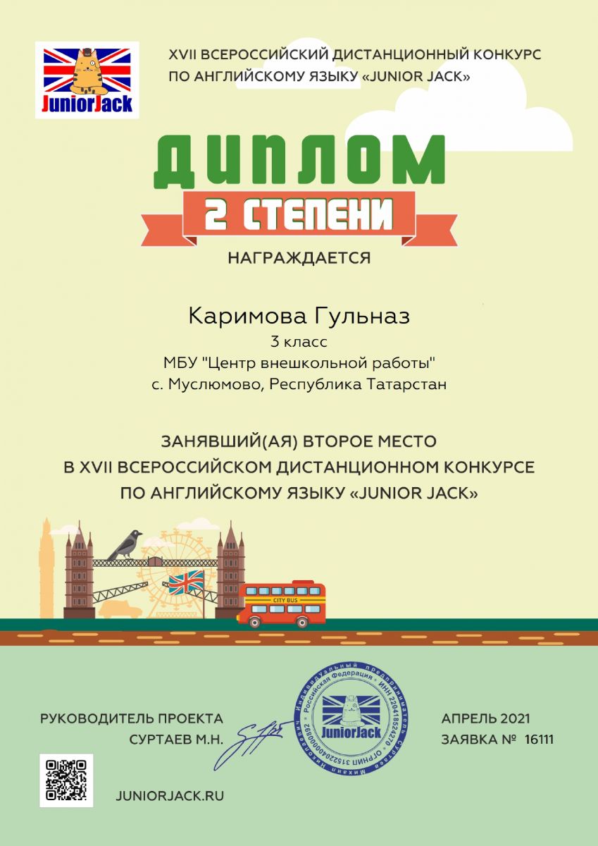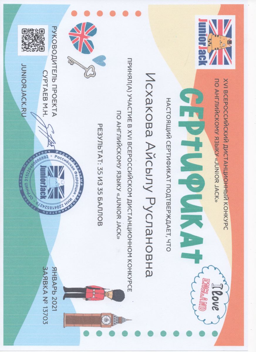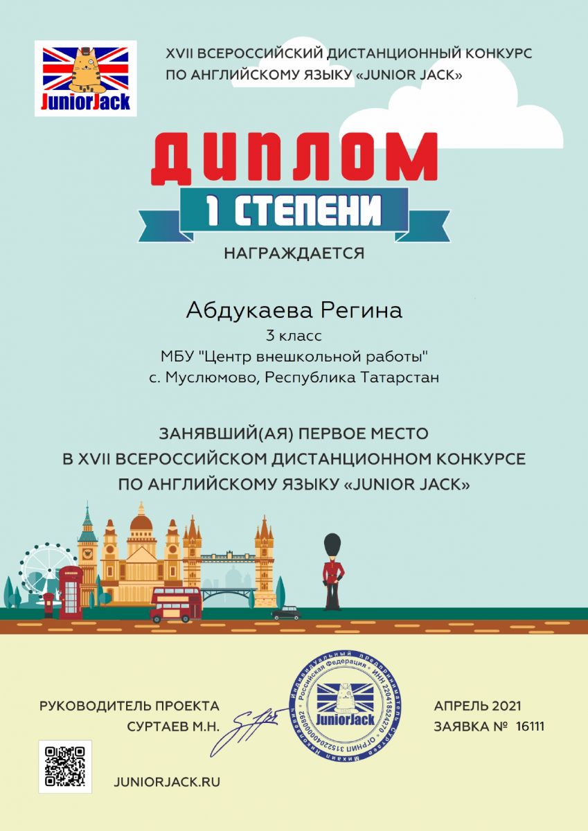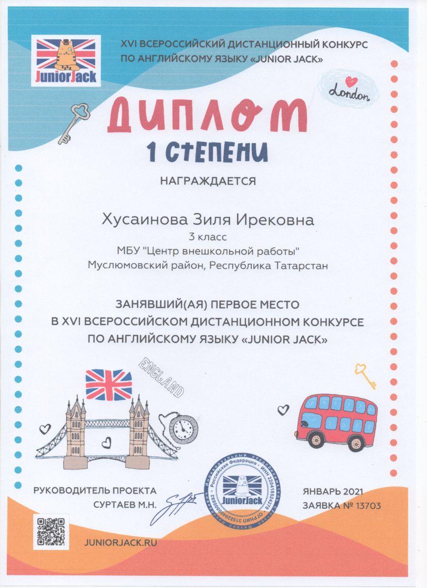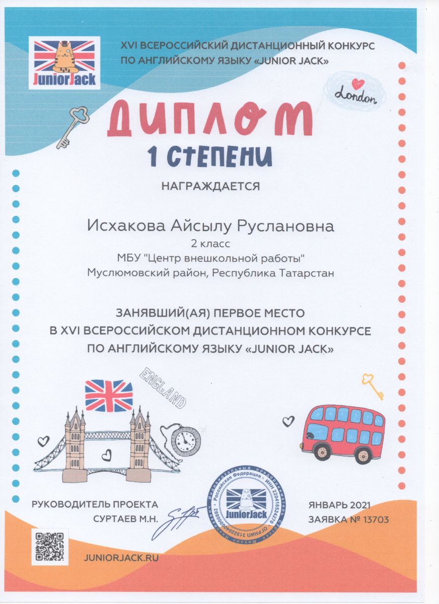 Диплом 1 степени Конкурса "Junior Jack" Исхакова А.