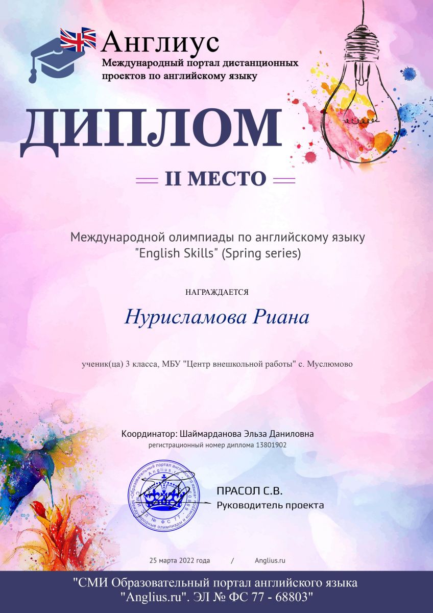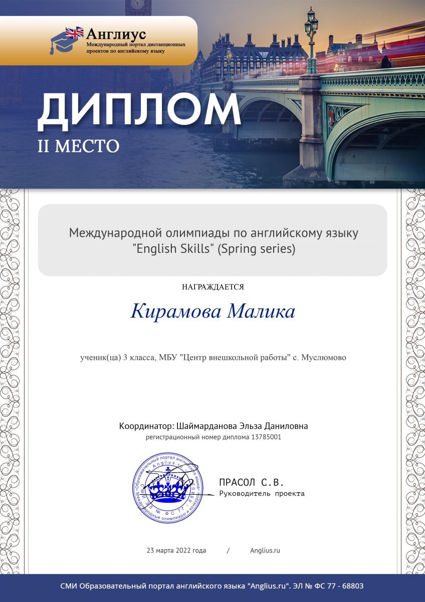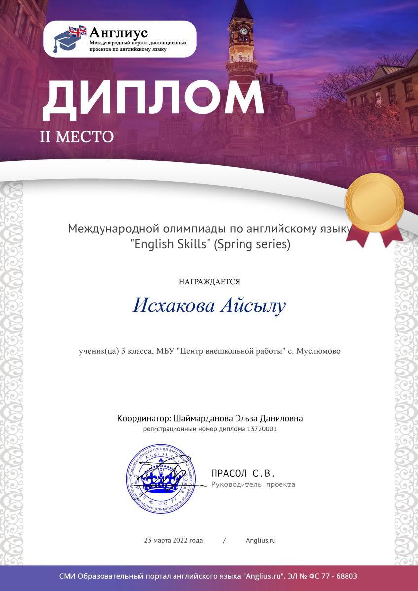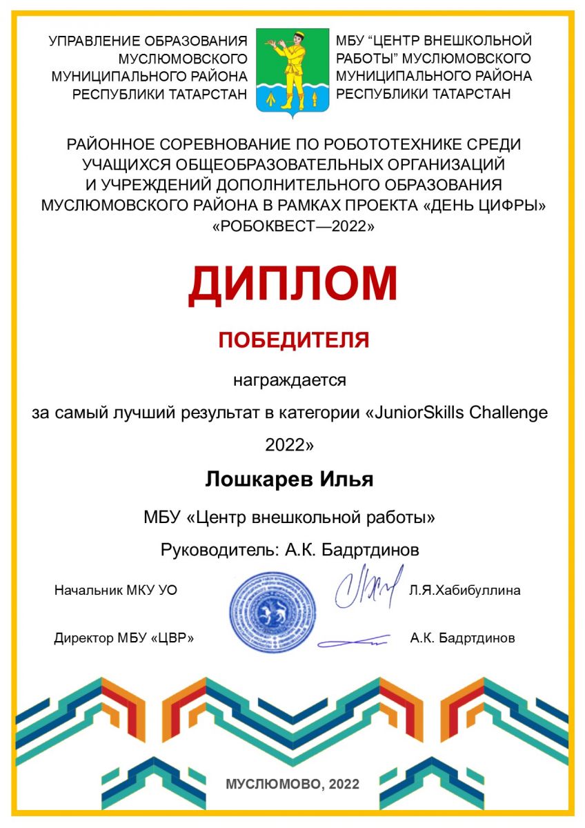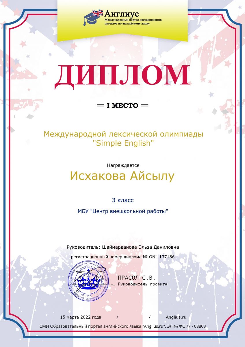 Диплом 1 степени Конкурса "Junior Jack" Исхакова А.