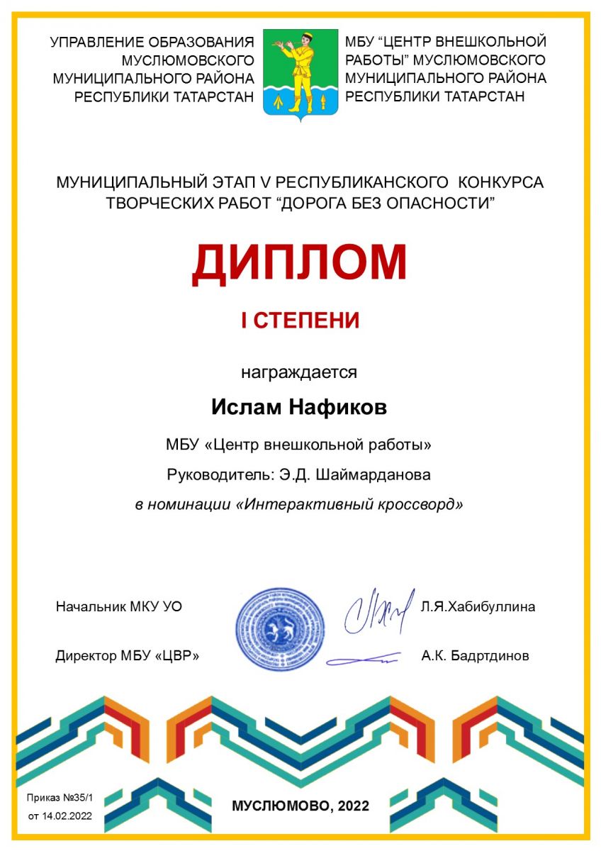 Диплом "Дорога БЕЗ опасности" Нафиков