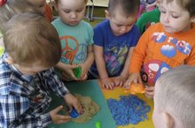 Дети первой младшей группы очень любят играть с кинетическим песком. Вместе с воспитателем дети лепят различные фигуры, изучают его свойства.
