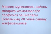 17 нче октябрь көнне,Мөслим районының гимназиясендә, Мөслим муниципаль районы мәгариф хезмәткәрләре профсоюз оешмалары Советының VII отчет-сайлау конференциясе үтте. Конференциядә бакчабызның профсоюз председателе Бадертдинова Гөлназ Илгизәр кызы катнашты.