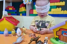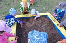 Беренче кечкенәләр төркемендә "Комлыкта" уены. Балаларның тере булмаган табигать объектлары, ком турында күзаллауларын формалаштыру; якын-тирә мохиткә карата кызыксыну тәрбияләү, әйләнә-тирә мохитне күзәтү белән кызыксынуны үстерү. Уен кул хәрәкәтләрен координацияләү үсешенә ярдәм итә. -