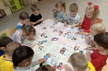 Кечкенәләр төркеме балалары бергәләп дус-тату булып ашъяулык буядылар. Буяу балаларга иҗат итәргә этәргеч бирә. Вак кул моторикасын, күзәтүчәнлекне, тырышлык һәм игтибарлылыкны үстерә.