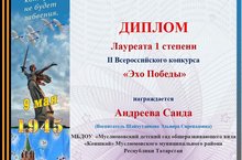 Менделеевск шәһәренең "SUPER ПОКОЛЕНИЕ" үсеш үзәге оештырган "Эхо Победы" республикакүләм шигырь конкурсында катнашып, икенче кечкенәләр төркемендә тәрбияләнүче Андреева Сәидә 1 дәрәҗә дипломга лаек булды. Афәрин, Сәидә, котлыйбыз!