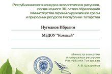 Мәктәпкә әзерлек төркеменә йөрүче Ногманов Ибраһим экология буенча республикакүләм конкурста катнашып сертификатка ия булды. Әлеге бәйге әйләнә-тирәлекне саклау һәм табигый байлыклар министрлыгы барлыкка килүгә 30 ел тулуга багышланган.