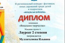 "Моңлы Ык буйлары" II региональ фестиваль-бәйгесендә Муллагалиева Илвина "Вокал" номинациясендә 2 дәрәҗә лауреат дипломына лаек булды. Җитәкчесе Алсу Сагдиеваны котлыйбыз, киләчәктә дә уңышлар телибез!