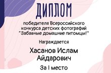 Хәсәнов Исламны "Йорт хайваннары" бәйгесендә 1 урын яулавы белән котлыйбыз. Әзерләгән тәрбиячесе Гөлзада Гавис кызына киләчәктә дә уңышлар телибез!