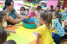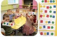 Кечкенәләр төркемдә "Шарлар һәм кубиклар" темасына кисеп-ябыштыру эшчәнлеге. Балалар яңа геометрик фигура – квадрат белән таныштылар. Квадрат белән түгәрәкне чагыштырырга тырыштылар. Эшчәнлектә тәрбияче балаларга түгәрәк һәм квадратны күрсәтте, бу ике фигураның охшашлыкларын һәм аерылмаларын күрсәтте. Җавапларны фигураларны контур буенча әйләндереп гомумиләштерде. Аннары балалар тәрбияче җитәкчелегендәге түгәрәк белән квадратны чиратлаштырып ябыштырдылар.