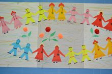 В подготовительной группе занятие по аппликации на тему "Веселый хоровод". Задачи занятия: развивать у детей эстетическое восприятие, воображение, творчество; учить вырезать на глаз симметричные формы из бумаги, сложеной вдвое; продолжать учить украшению, вырезанного из бумаги изображения; развивать зрительный контроль за движением рук, координацию движений; закрепить знание цветов и их оттенков; продолжать обучение коллективной аппликации, учить обсуждать композицию, выслушивать мнение других детей; учить располагать фигуры в ряд на узкой полосе, прививать аккуратность при наклеивании.