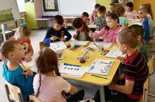 В подготовительной группе занятие по рисованию на тему "Лето". Цели занятия: формировать умение детей отражать свои впечатления о лете в рисунке, располагая изображения на широкой полосе: выше, ниже по листу (ближе, дальше). Закреплять приемы работы кистью и красками, умение составлять нужные оттенки цвета на палитре, используя для смешивания белила и акварель. Учить рассказывать о том, что нарисовали.