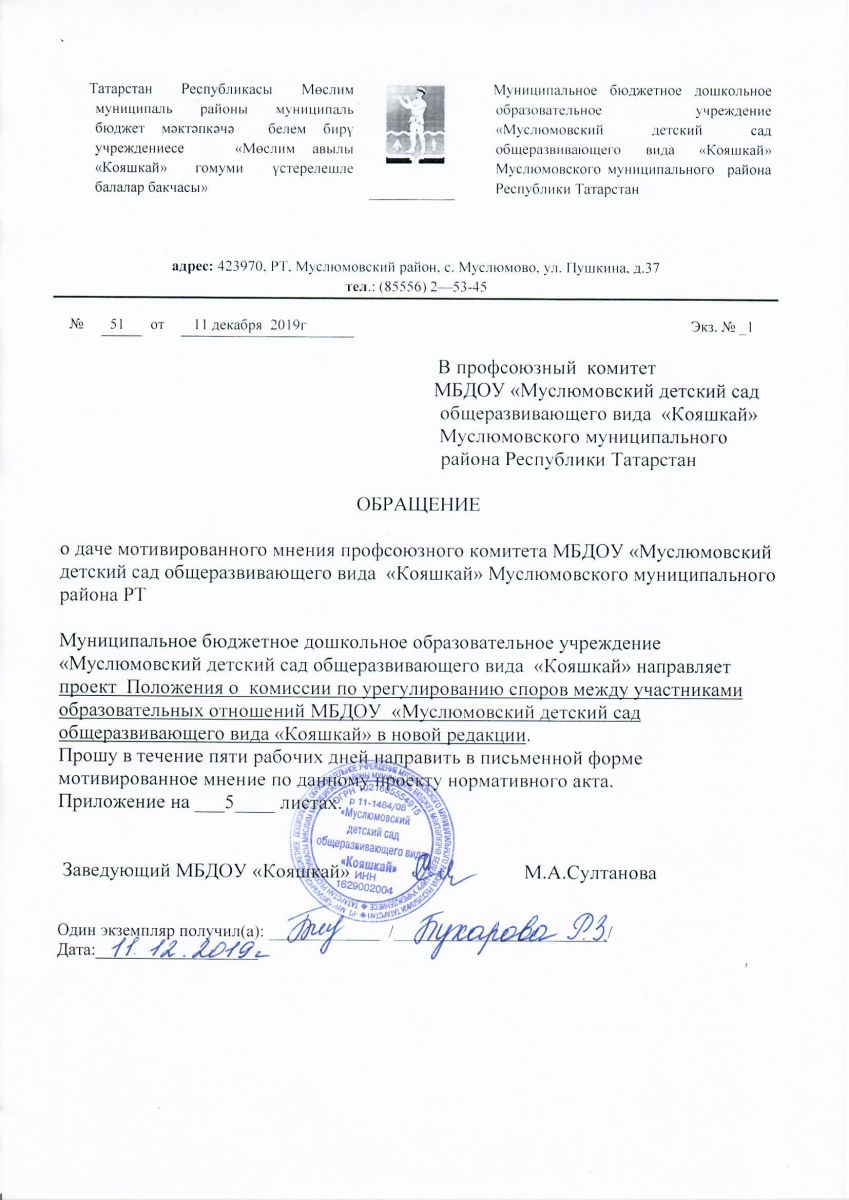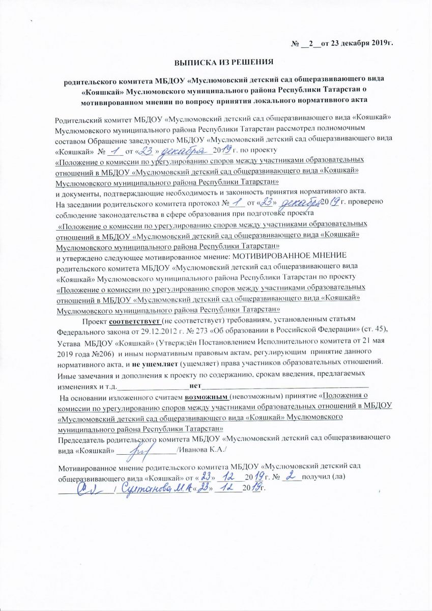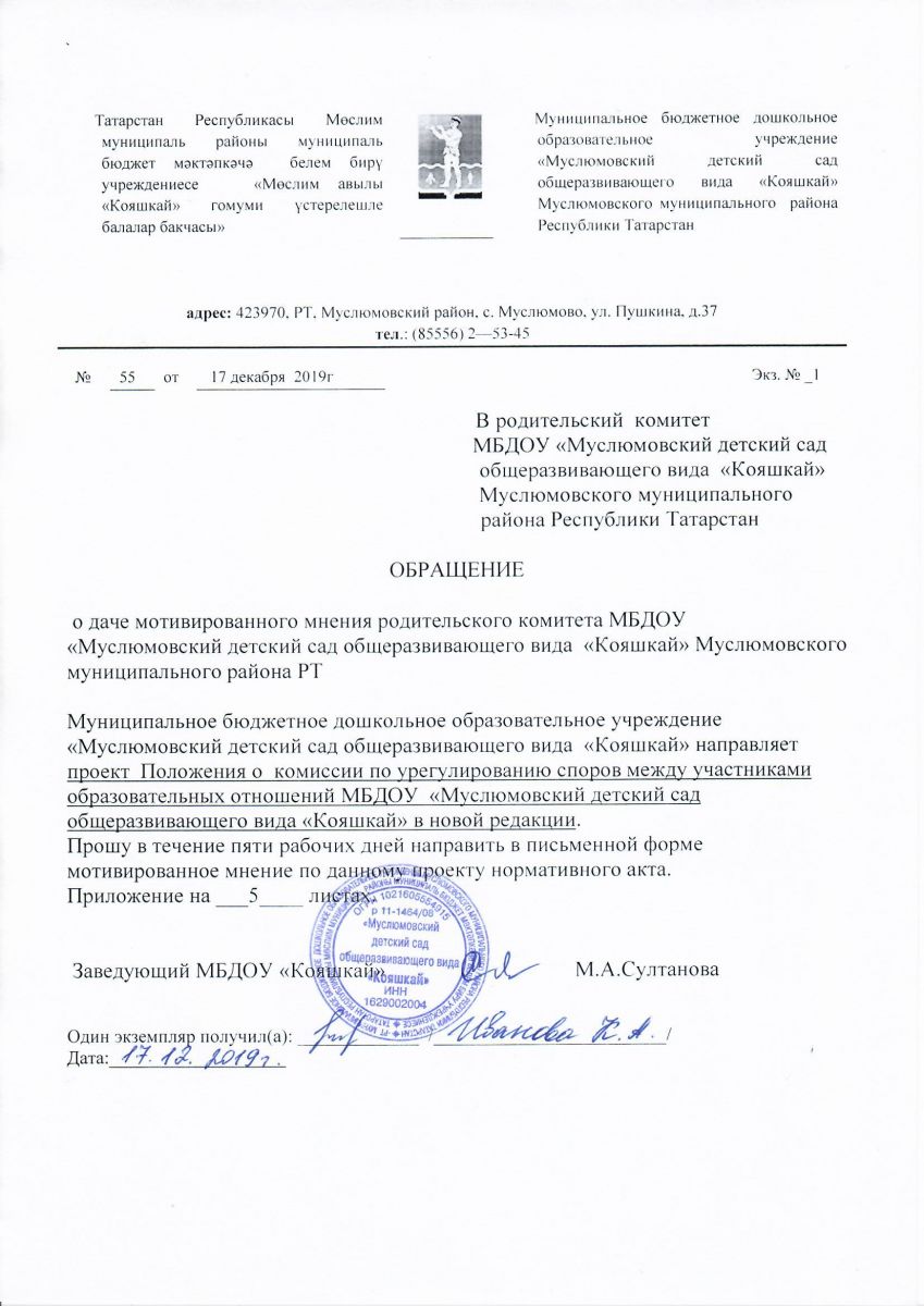 Обращение о даче мотивированного мнения родительского комитета