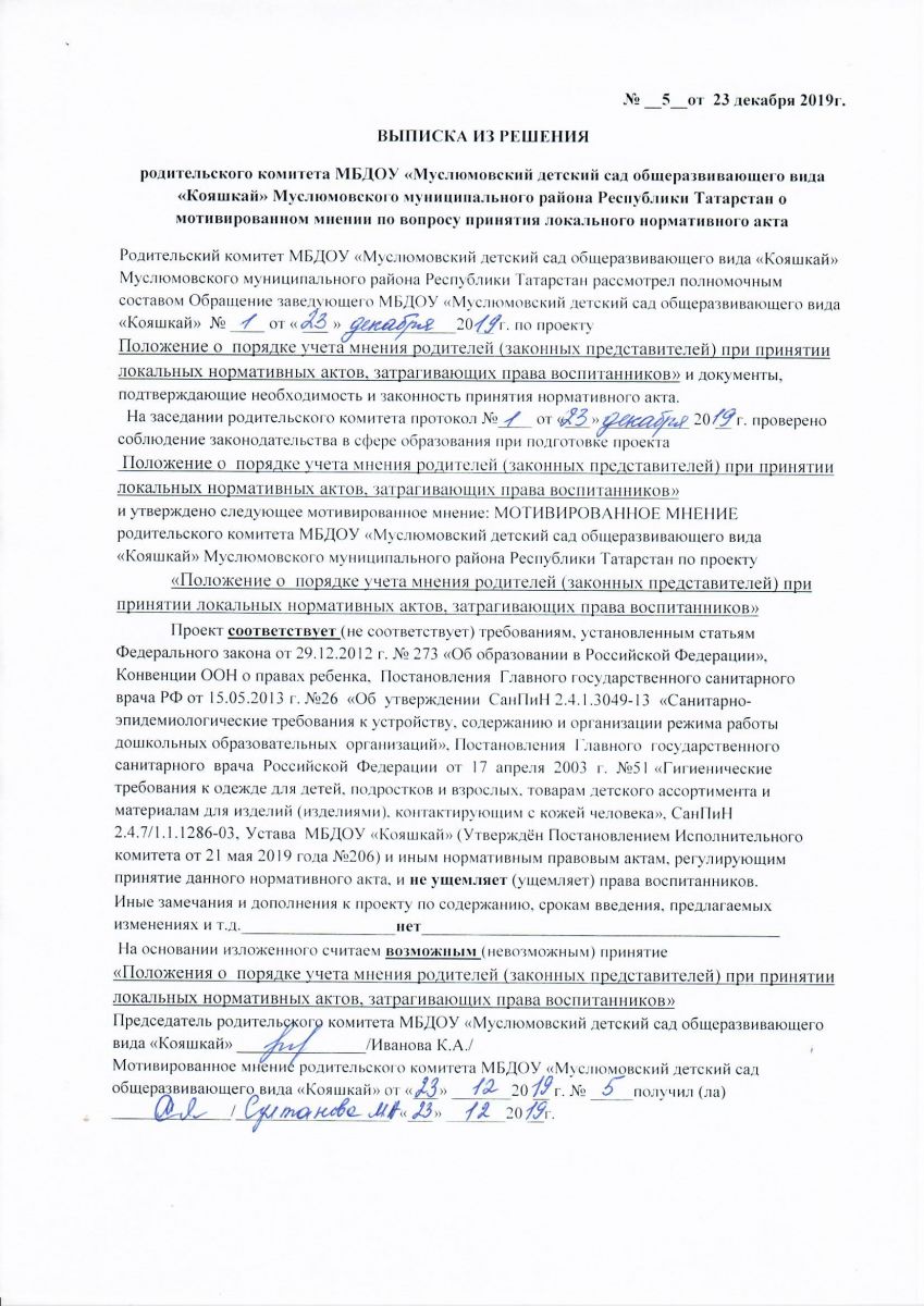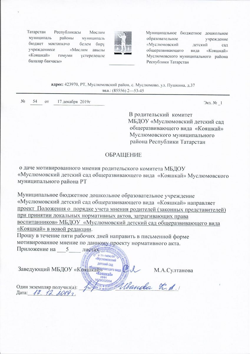 Обращение о даче мотивированного мнения родительского комитета
