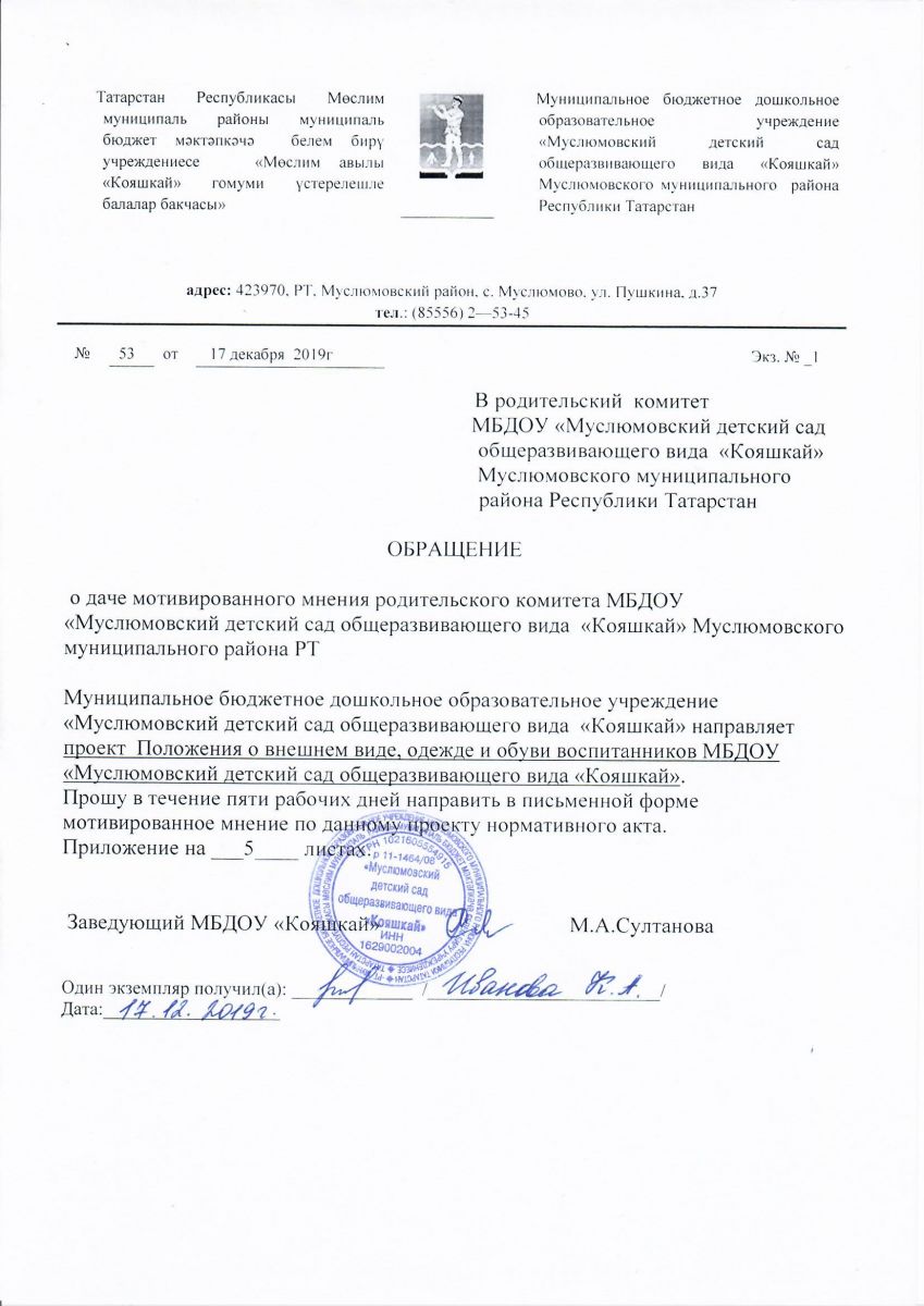 Обращение о даче мотивированного мнения родительского комитета