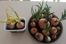 Тәҗрибә үткәрү максатыннан, суган утыртылган бер савытны яктыга, тәрәзә төбенә, а икенчесен караңгы урынга куйдык.