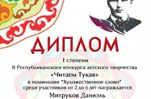 "Тукайны укыйбыз" II Республикакүләм балалар иҗаты конкурсы нәтиҗәләре буенча уртанчылар төркемендә тәрбияләнүче Митруков Даниэль 1 нче дәрәҗә дипломант булды.