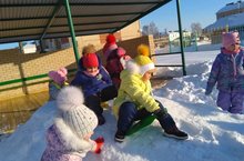 Уртанчылар төркеме балалары саф һавада уйнаганда таудан шуалар.Во время прогулки дети средней группы катаются с горки на ледянках.