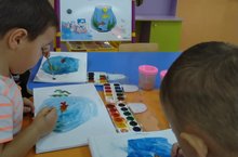 Уртанчылар төркемендә рәсем шөгыле. Тема: "Аквариум". Балалар башта трафареттан аквариум контурын альбомга төшерделәр, аннары зәңгәр төскә буядылар. Аннан соң балыклар, ташлар һәм үсемлекләр ясадылар.
