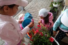 Мөслим районы "Ләйсән" балалар бакчасының зурлар төркеме балалары, көндә тәрбиячеләр белән берлектә, утырткан чәчәкләрне тәрбияләп, төпләрен йомшартып, су сибеп, җәй әйләнәсендә үз куллары белән матурлык булдыралар.
