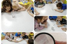 Воспитанники средней группы наблюдали за круговоротом воды в природе. Ребята сделали выводы о том, что снег превращается в воду, а вода-в пар. Они исследовали осадок, оседающий на краю стакана после испарения воды.