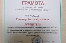 Безнең уңышларыбыз. Тәрбиячеләребез "Мәктәпкәчә яшьтәге балалар өчен иң яхшы уен мөхите" дип аталган муниципаль конкурста катнашып, призлы урыннар яулады.