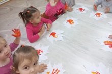 "Яфраклар коела ". "Яфраклар коелу" композициясен булдыру. Бармак куллар белән буяу техникасын үзләштерү, кулларны буяуга батырып кәгазьгә эз ясау. Рәсем ясауга кызыксыну тәрбияләү.