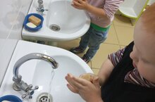 Мы продолңаем учить детей под контролем взрослого, а затем самостоятельно мыть руки после загрязнения и перед едой, насухо вытирать лицо и руки личным полотенцем.