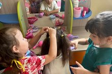Узнали для чего нужны эти предметы (феном сушат волосы, расческой расчесывают волосы, ножницами подстригают волосы). Попробовали плести волосы, учились разговаривать с клиентами. Дети пробовали себя в роли мастеров и клиенток. Дети с большим интересом играли и наблюдали за игрой.