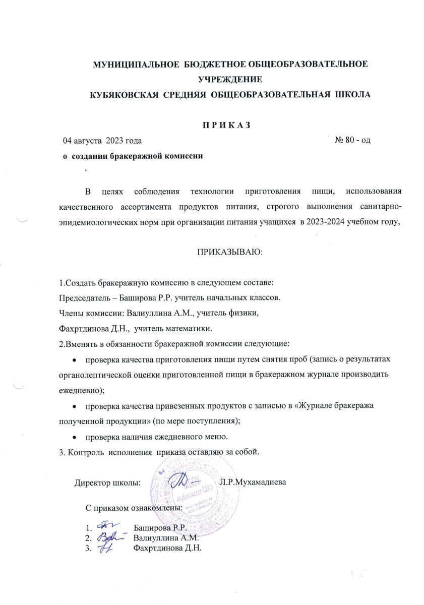 Приказ о создании комиссии по изучению вопросов организации питания 2023-2024 уч.год