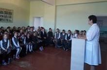1- 11 класс укучылары каршында Иске карамалы участок врачлык амбулаториясе өлкән шәфкать туташы Галеева З.Ә. "Салкын тиюләр һәм гриипны кисәтү" темасына чыгыш ясады./ Перед учащимися 1-11 классов выступила старшая медсестра Старокарамалинской врачебной амбулатории Галеева З.А. по теме "Профилактика простудных заболеваний и гриппа"